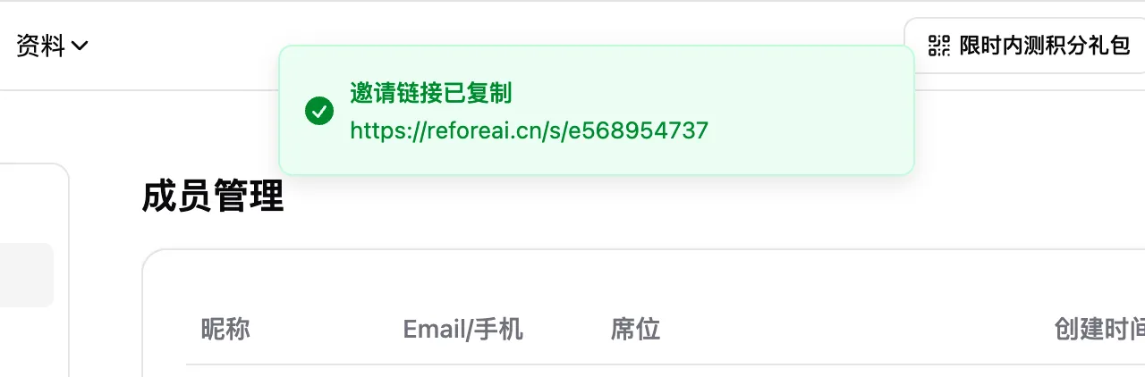 生成邀请链接按钮,会有如下提示,类似 https://reforeai.cn/s/xxxxxxx 的链接已复制到您的剪贴板,只需将链接发送给您的团队成员即可。