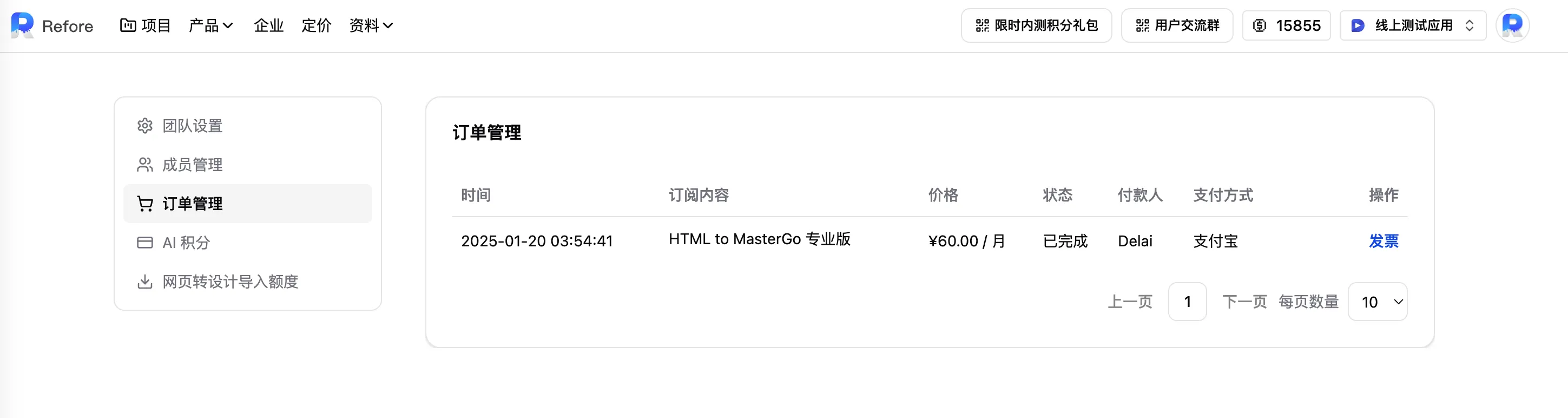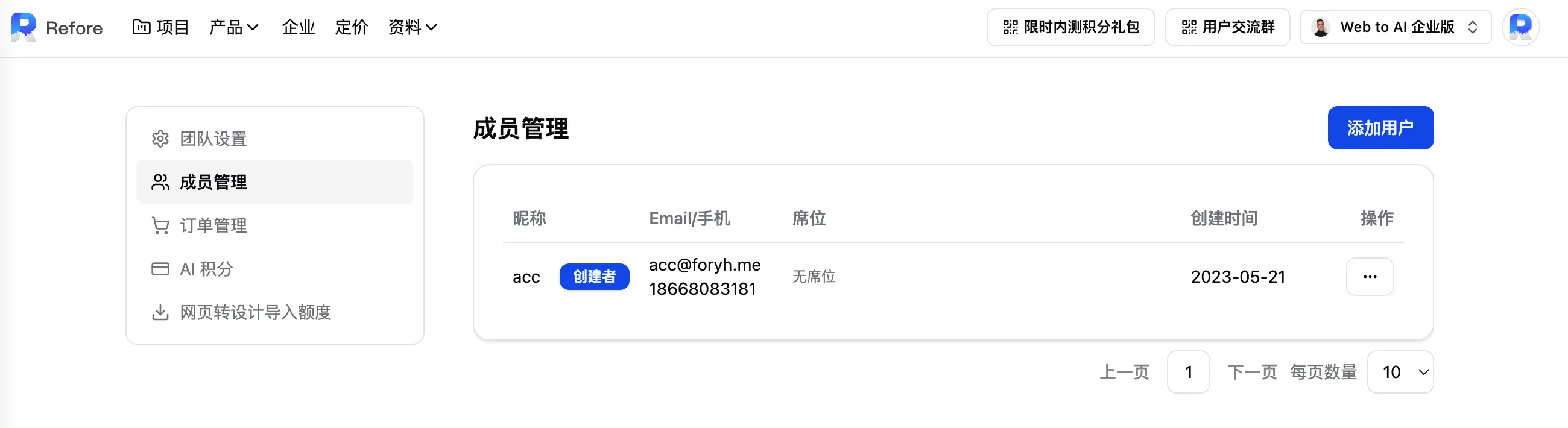 购买 Refore 网页转设计 团队版的流程与购买专业版相同,前往官网价格页,选择团队成员数量,购买成功后可以随时调整。