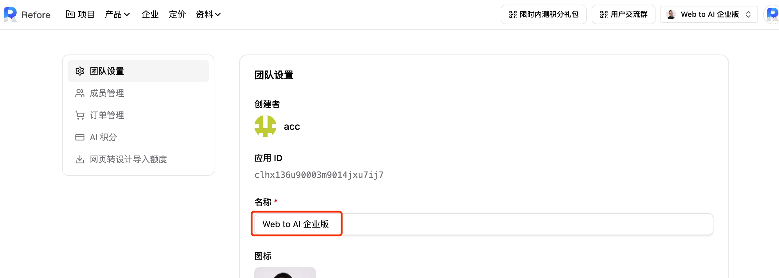 为了帮助团队成员在接受邀请后准确选择应用,建议修改您的应用 Logo 和名称。您可以在“成员”标签页左侧的“团队设置”https://reforeai.cn/team-setting中进行修改。